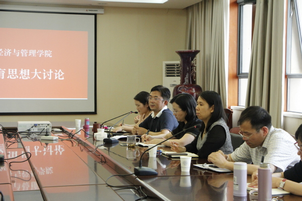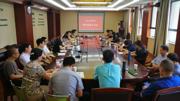 周德群院长首先传达了学校教育思想大讨论启动会上聂宏校长主题报告精神,传达了郑永安书记关于思想大讨论的指导意见,并结合学院实际,跟与会老师们交流沟通了72886必赢欢迎光临“培养什么人”“如何培养人”的思考与想法,将教育思想大讨论与学院“综合改革方案”相结合,对学院教育思想大讨论工作做了部署,希望所有老师结合教学、科研及育人实际,有效落实任务。接着,学院副院长王英、邓晶,学院党委副书记涂志宏分别就分管工作,谈了推动落实学校教育思想大讨论工作的想法。最后,焦宏图书记鼓励大家以高度的责任感、使命感,积极参与思想讨论,以问题为导向,认真做好调查研究和实践,凝聚全体经管人的智慧力量,更好地谋划学校学院的未来发展。