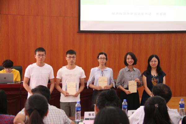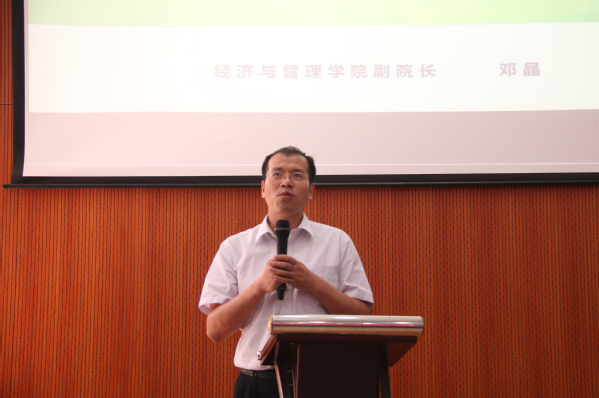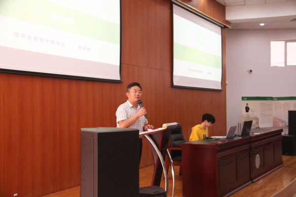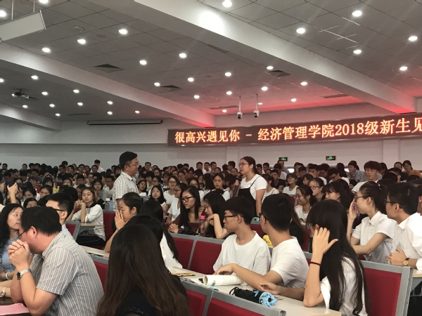 本科生新生尹佳怡代表新生发言,表达了对大学的向往;为帮助新生更快适应大学学习生活,学院为每个班级安排了高年级学导,王英和王子龙为学导们授发聘书;邓晶作为教师代表发言,表达了对2018级新生的殷切期望,祝愿每位同学在经管院都能学有所成;焦宏图代表学院赠予本科生新生代表《如何读大学》、研究生新生代表《乡土中国》,激励同学们能在大学里更加务实、更加专注,走好学习生涯的每一步;马静、谢嗣胜、袁潮清三位系主任依次以一句话寄语新生,并对即将开展的本科生、研究生系部见面会发出邀请;最后的院长致辞环节中,周德群院长再次与新生们互动:为什么读大学、为什么读研究生,周院长从回归兴趣、回归梦想、回归课堂、回归本质四个方面勉励新生们,不断明确目标、砥砺前行,选择自己所热爱的方向并为之奋斗。