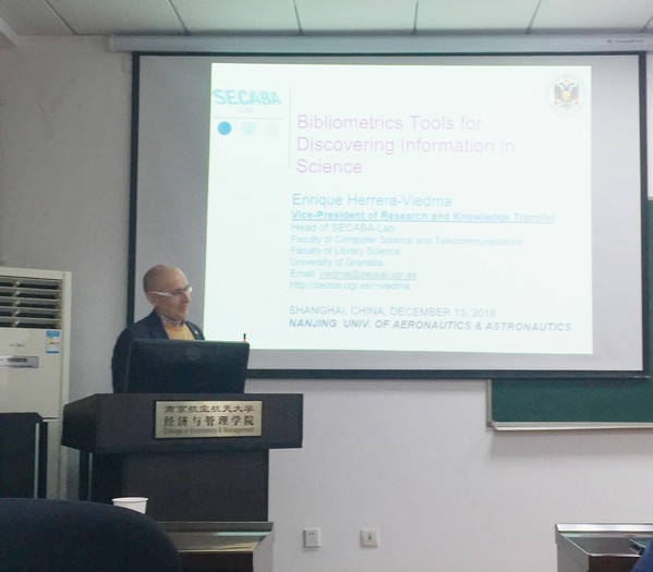 2018年11月13日上午,格拉纳达大学计算机科学和人工智能专业的教授Enrique Herrera-Viedma受必赢官网智能决策与风险分析研究所邀请,72886必赢欢迎光临做了题为Bibliometric Tools for Discovering Information in Science的讲座。72886必赢欢迎光临朱建军教授、章玲教授、关叶青副教授、河沙玮讲师等老师以及部分硕博研究生参与了活动。