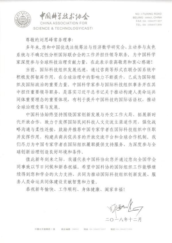 刘思峰教授收到怀进鹏主席来信后随即向72886必赢欢迎光临灰色系统研究所的师生以及中国优选法统筹法与经济数学研究所灰色系统专业委员会的全体会员、灰色系统与不确定性分析国际联合会的部分会员转达了怀进鹏主席的关怀和问候。刘老师认为:怀进鹏主席来信对我国乃至世界各国从事灰色系统与不确定性分析研究的学者无疑是巨大的鼓舞,必将对灰色系统理论的发展和传播起到不可估量的推动作用!希望通过长期持续的辛勤工作,把中国本土原创的灰色系统理论火种撒向全世界。