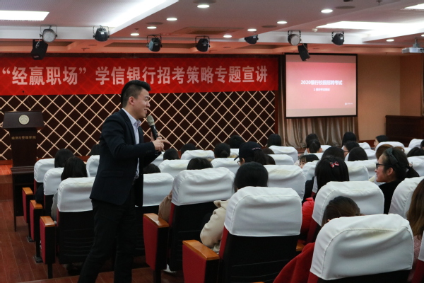 银行是经管学生毕业后的主要就业方向,为了提高学生的行业认知,提升就业竞争力,3月12日晚上,学院邀请江苏省高校招生就业指导服务中心下属的学信学院教学研究院副院长梅高翔来必赢官网开展了主题为“2020届毕业生银行招考策略”的宣讲会。