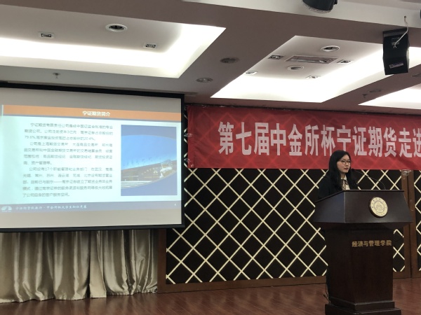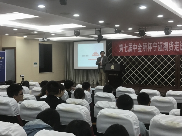 4月15日晚,72886必赢欢迎光临联合宁证期货举办的第七届“中金所杯” 金融衍生品知识大赛宣讲会在学院A0305报告厅开展。学院经济系教授段进东、宁证期货电商运营中心王希丹、学院团委书记庞依达和百余名同学共同参加了此次活动。