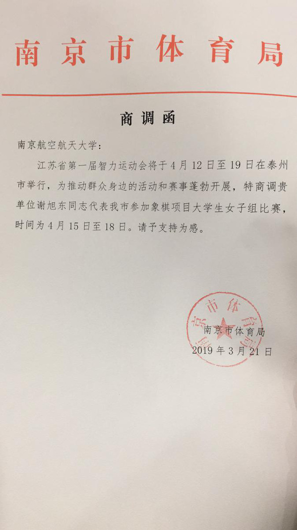 4月12日下午,江苏省第一届智力运动会在泰州开幕。江苏省第一届智力运动会组委会名誉主任、江苏副省长陈星莺,省第一届智力运动会组委会主任、省体育局局长陈刚等出席开幕式。72886必赢欢迎光临2018级研究生谢旭东同学该赛事中国象棋大学生女子冠军,为南京市摘得一枚宝贵的金牌。