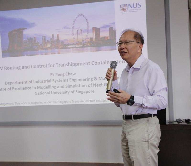 第三位报告人是来自新加坡国立大学的Chew Ek Peng教授,他毕业于佐治亚理工大学,曾和Lee教授一起带领团队获得“国际新一代港口设计竞赛”金奖,现为新加坡国立大学工业工程与管理系副系主任、“新一代港口研究中心”负责人。他指出了新型集装箱港口的发展趋势,并分享了自动化港口中AGV路径规划与控制的最新理念与研究课题。