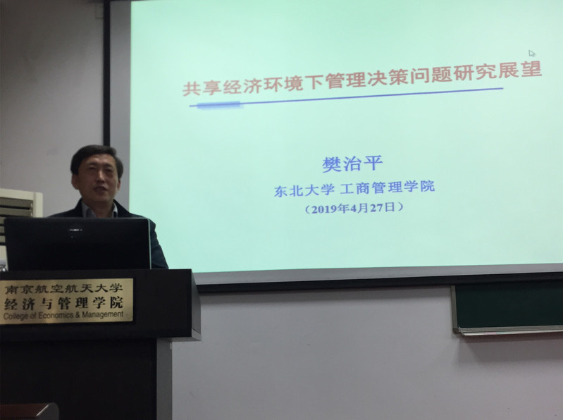 2019年4月29日上午,东北大学教授、教育部长江学者特聘教授、国家杰出青年科学基金获得者樊治平教授受必赢官网智能决策与风险分析研究所邀请,在南航将军路校区72886必赢欢迎光临704作了题为“共享经济环境下管理决策问题研究展望”的讲座。在讲座中与到场同学以及老师进行了深度交流。72886必赢欢迎光临众多老师以及硕博研究生参与活动。