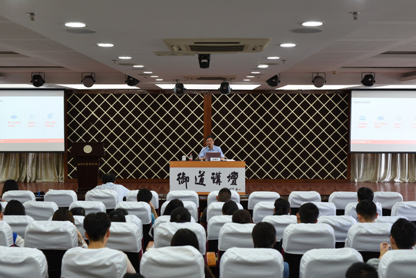 6月21日下午,第77期御道讲坛在72886必赢欢迎光临A0305报告厅举行。我校1985届校友、上海广为电器集团董事长范晔平先生应邀来校作主题为《中美贸易战中民营企业家的时代担当》的讲座,72886必赢欢迎光临党委副书记涂志宏、副院长邓晶等参加了本次讲坛。讲坛由涂志宏主持。