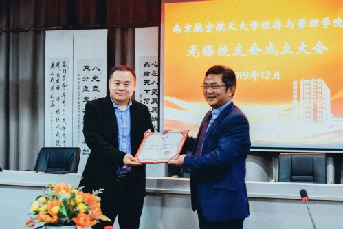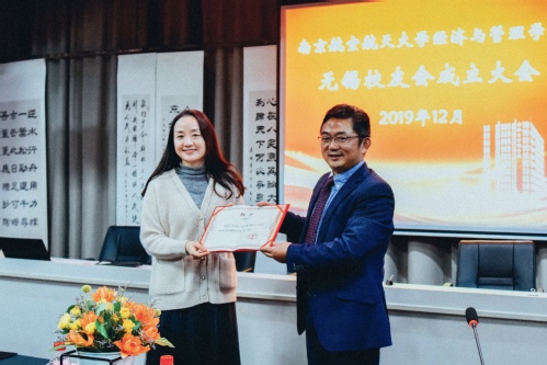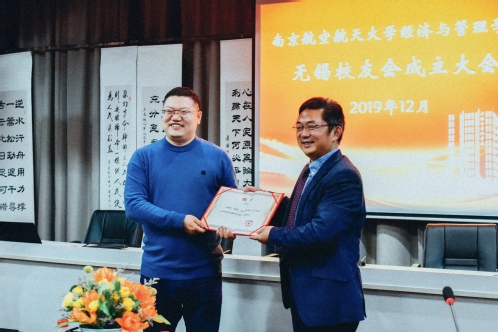 紧接着,涂志宏宣布学院无锡校友会第一届理事会成员名单,无锡市三杯茶公益发展中心理事长陈君怡当选会长,江南大学商学院副院长王育红当选副会长,江苏蓝航灏宇科技服务有限公司总经理陈剑当选秘书长,江南大学商学院教师刘震当选副秘书长。周德群为理事会成员颁发聘书,并宣布学院无锡校友会正式成立。