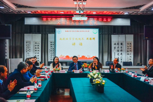 授聘仪式结束后,王育红代表学院无锡校友会致辞,他为学院如今取得的成就感到欣喜和自豪,他表示无锡校友会将会秉承“智周万物,道济天下”的校训和“尚德励学,筹策济世”的院训,充分发挥无锡地区的区位优势,为学院的建设发展添砖加瓦,为人才培养工作增添新动能。