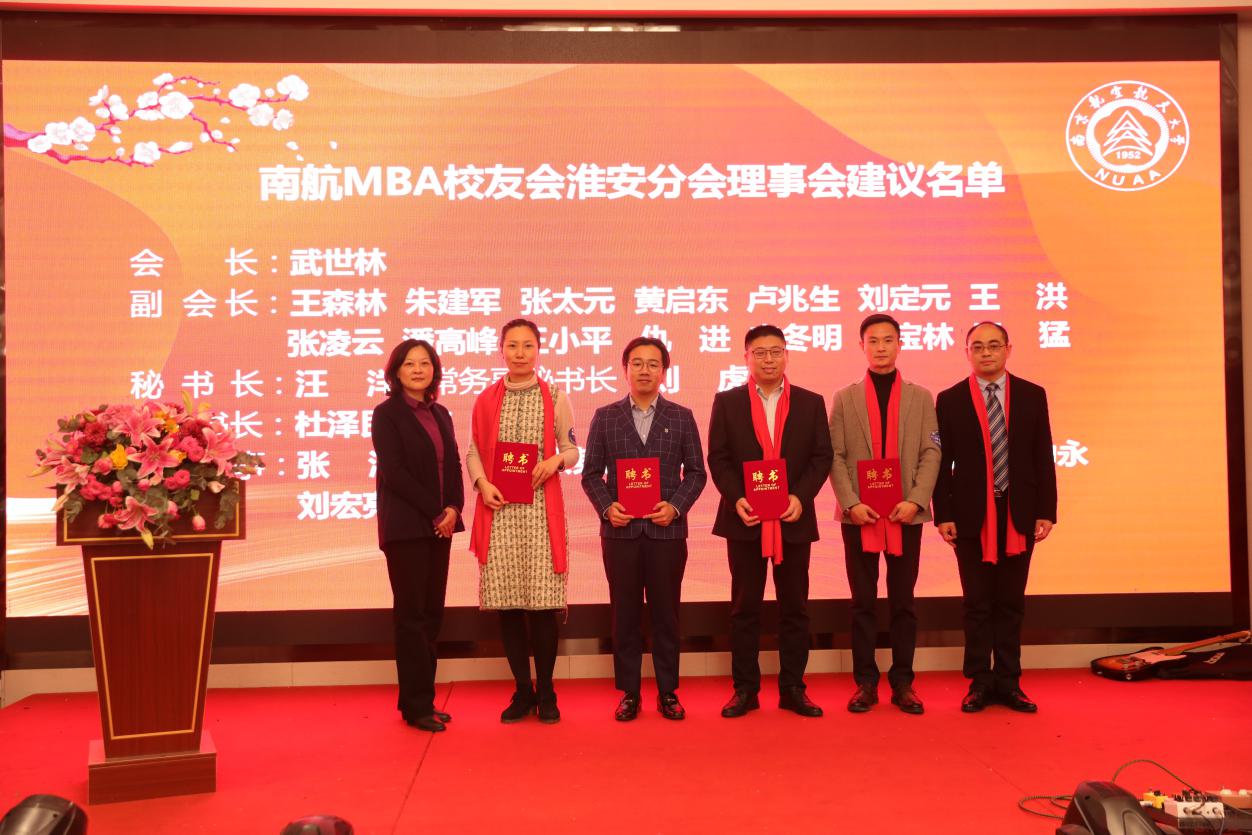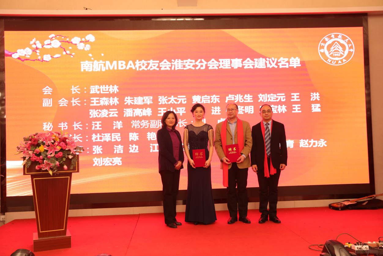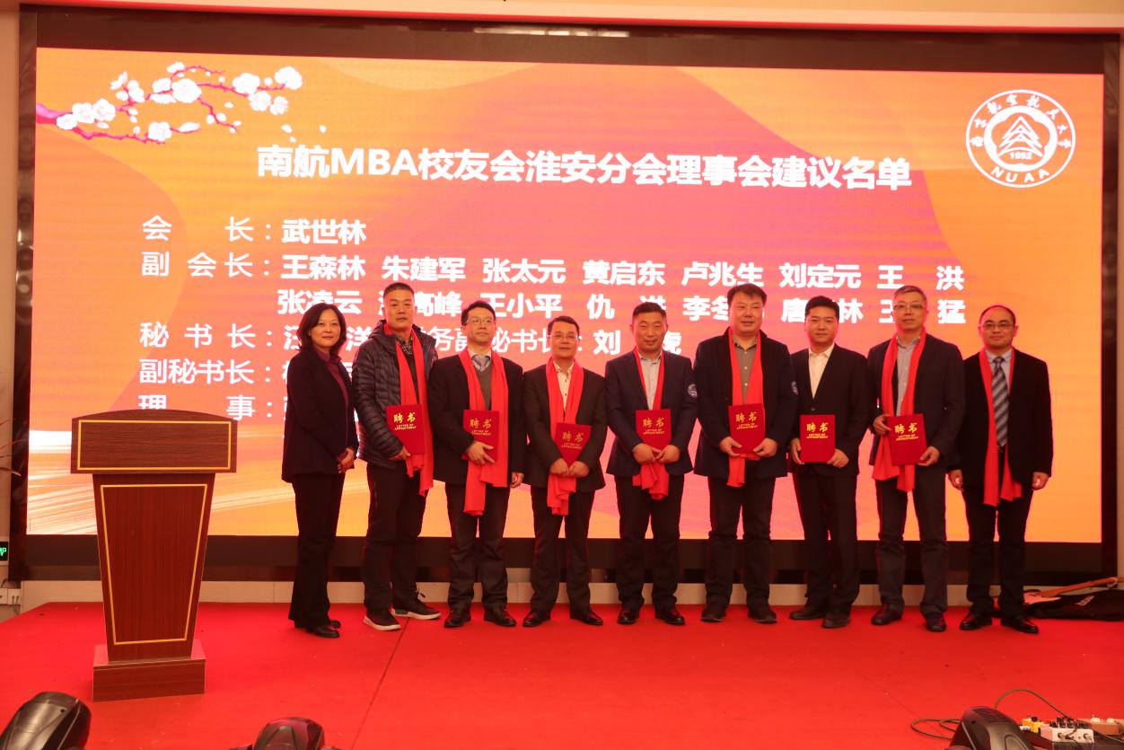 12月28日,72886必赢欢迎光临MBA校友会淮安分会成立大会在淮安成功召开。淮安市教育局局长张元贵,淮安市人力资源与社会保障局副局长王乃岩,淮安市人才中心主任陈朝晖,淮安市就业管理中心副主任刘兆尚,淮安天士力药业副总经理杨国军,万香科技股份有限公司副总经理陈兆钢,淮安经济开发区热电有限公司常务副总经理张德善,淮安柴米河农业科技股份有限公司王其传,南航党政办/发展联络部副部长、校友总会副秘书长张钟勤,72886必赢欢迎光临副院长王子龙,党政办/发展联络部校友会办公室主任单晶,MBA教育中心执行主任、南航MBA校友会秘书长杜刚,MBA教育中心学生工作与职业发展办公室主管祝少琪,经管院校友工作秘书许志卓以及淮安各界200多位校友代表欢聚一堂,共同庆祝南航MBA校友会淮安分会的成立。