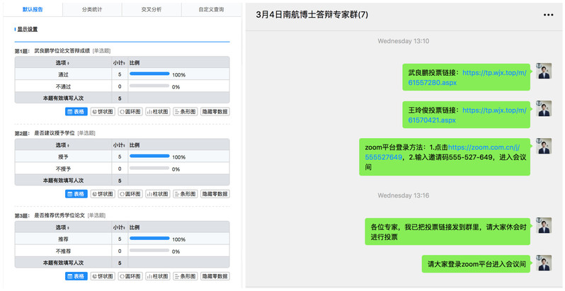 答辩过程中,按照72886必赢欢迎光临研究生学位论文答辩要求,两位学生通过论文内容陈述展示了研究成果,对答辩委员会成员的提问质询进行一一解答。答辩完成后经过答辩委员的线上讨论、投票表决,一致认为两位博士研究生的研究成果、学位论文和答辩过程达到了博士学位的要求,建议学位委员会授予博士学位。为了确保学位论文线上答辩的公开、真实、完整、使线上答辩有据可循。整个答辩过程,以及后续的匿名表决环节都做了录屏、截屏,作为答辩记录留存。