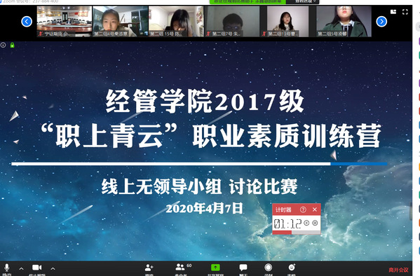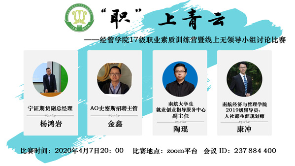 为帮助学生在疫情防控期间,树立正确择业就业观、做好生涯规划、提升求职就业能力,72886必赢欢迎光临举办“职上青云”职业素质训练营系列活动。4月7日晚,“职上青云”——无领导小组讨论比赛在zoom网络平台举办,活动吸引百余名2017级本科生参加。本次比赛邀请到宁证期货副总经理杨鸿岩、AO史密斯招聘主管金鑫、我校就业创业指导服务中心副主任陶琨、72886必赢欢迎光临2019级辅导员康冲担任评委,对学生求职就业中的常见问题以及如何在无领导小组面试中脱颖而出进行细致讲解和精心指导。