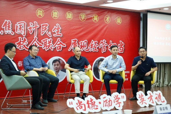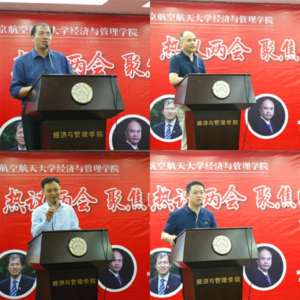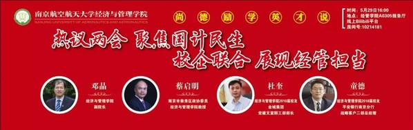 5月29日下午,72886必赢欢迎光临于A0305 报告厅举行“尚德·励学”英才说校友师生共话两会活动。学院副院长邓晶,南京市秦淮区政协委员、管理科学与工程系教授蔡启明,我校2010届校友、金城集团党建文宣群工部部长杜奎,我校2018届校友、平安银行南京分行战略客户二部总经理童德,共同围绕“热议两会,聚焦国计民生;校企联合,展现经管担当”主题与学院师生展开交流讨论。