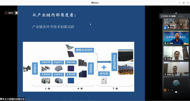 本次论坛在72886必赢欢迎光临教授张钦主持下开始。江苏省光伏产业协会的张红升秘书长从“实物量上升,价值量下降”、“出口不断攀升,出口方向增加”、“主要产品在全国的占比继续下降”等8个方面回顾了2019年江苏省光伏产业运行情况,并对疫情后光伏产业发展趋势做出了研判。