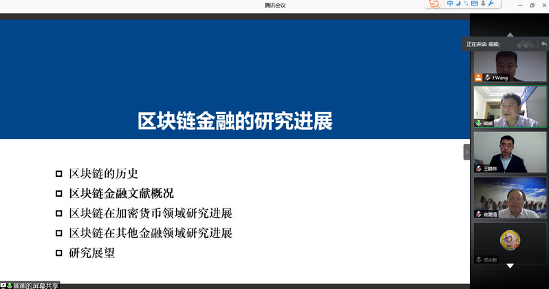 10月12日,天津大学教授熊熊应学院金融研究所邀请,在线为我校师生作了题为“区块链金融研究进展”的精彩学术讲座。本次讲座由金融研究所所长王建立主持。72886必赢欢迎光临副院长王群伟、教授袁潮清、朱庆缘、副教授桑秀芝、陆珩瑱、讲师苏飞等教师及部分硕、博研究生共一百四十多人参加了本次学术交流。