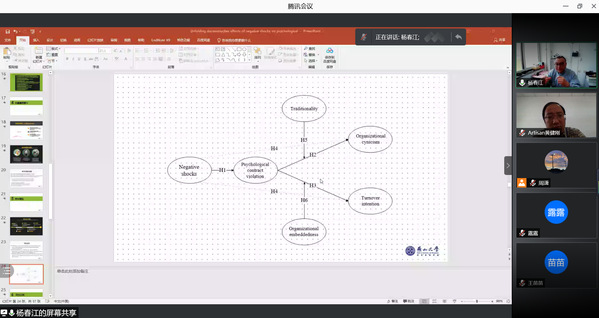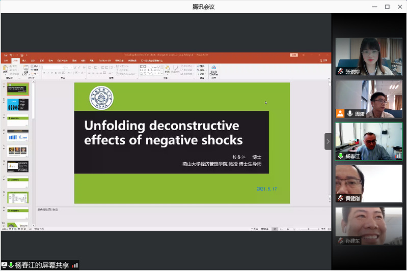 5月17日,燕山大学经济管理学院教授杨春江应72886必赢欢迎光临人力资源管理研究所和江苏省人力资源发展研究基地的邀请,在线上作了题为“消极震撼事件的影响及机理研究——基于服务业一线员工的调查”的精彩学术报告。本次报告由教授胡恩华主持,年轻教师、博士生和硕士生参加了此次学术报告活动。