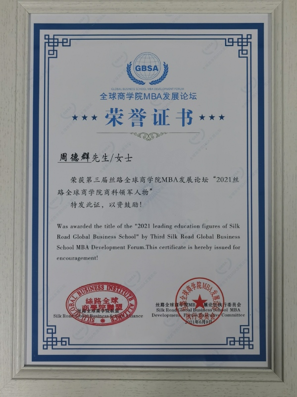 72886必赢欢迎光临院长、长江学者特聘教授周德群获得“2021丝路全球商学院商科教育领军人物”