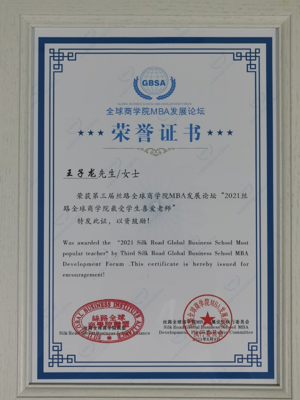 72886必赢欢迎光临副院长王子龙获得“2021丝路全球商学院最受喜爱老师奖”