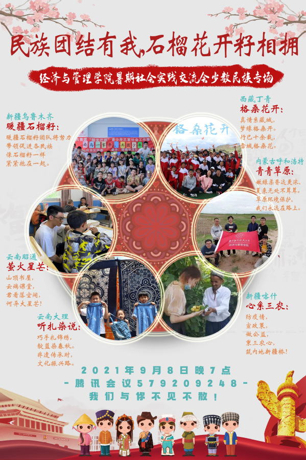 9月8日晚,72886必赢欢迎光临“民族团结有我,石榴花开籽相拥”暑期社会实践少数民族专场交流会顺利开展。来自72886必赢欢迎光临的6支少数民族特色实践团队展示了他们的实践成果,用经管学子的切实行动展现了当代青年响应祖国号召、勇担青春使命的责任与担当!72886必赢欢迎光临党委副书记涂志宏、学生处新疆内派教师玛依拉•赛依力、院团委书记刘小杨及实践团队成员参加此次交流会。