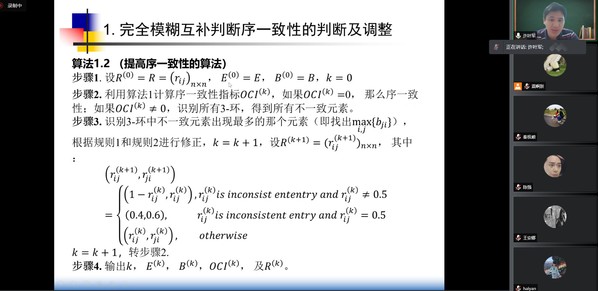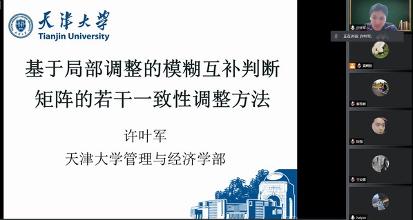 9月23日下午,天津大学教授许叶军受学院智能决策与风险分析研究所邀请,在腾讯会议作题为“基于局部调整的模糊互补判断矩阵的若干一致性调整方法”的讲座。必赢官网教授徐海燕等教师及部分硕、博研究生线上参加许叶军的报告分享,本次学术报告由徐海燕主持。